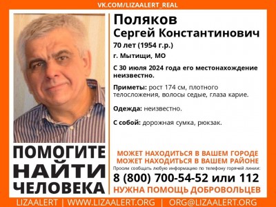 Приметы пропавшего: рост 174 см, плотное телосложение, седые волосы, карие глаза. С собой у него были дорожная сумка и рюкзак.