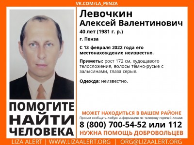 Волонтеры поискового отряда «ЛизаАлерт» сообщили о пропаже 40-летнего жителя областного центра. Левочкин Алексей Валентинович не появлялся дома с 13 февраля 2022 года.