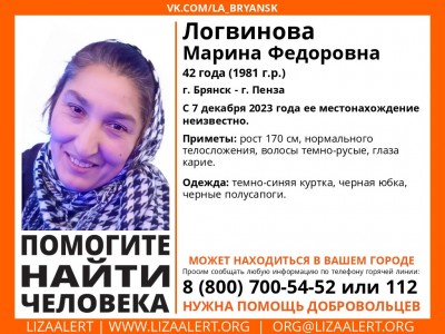 Женщина может находиться в Пензе или Брянске. Приметы пропавшей: рост 170 см, нормальное телосложение, темно-русые волосы, карие глаза. Была одета в темно-синюю куртку, черную юбку и черные полусапоги.