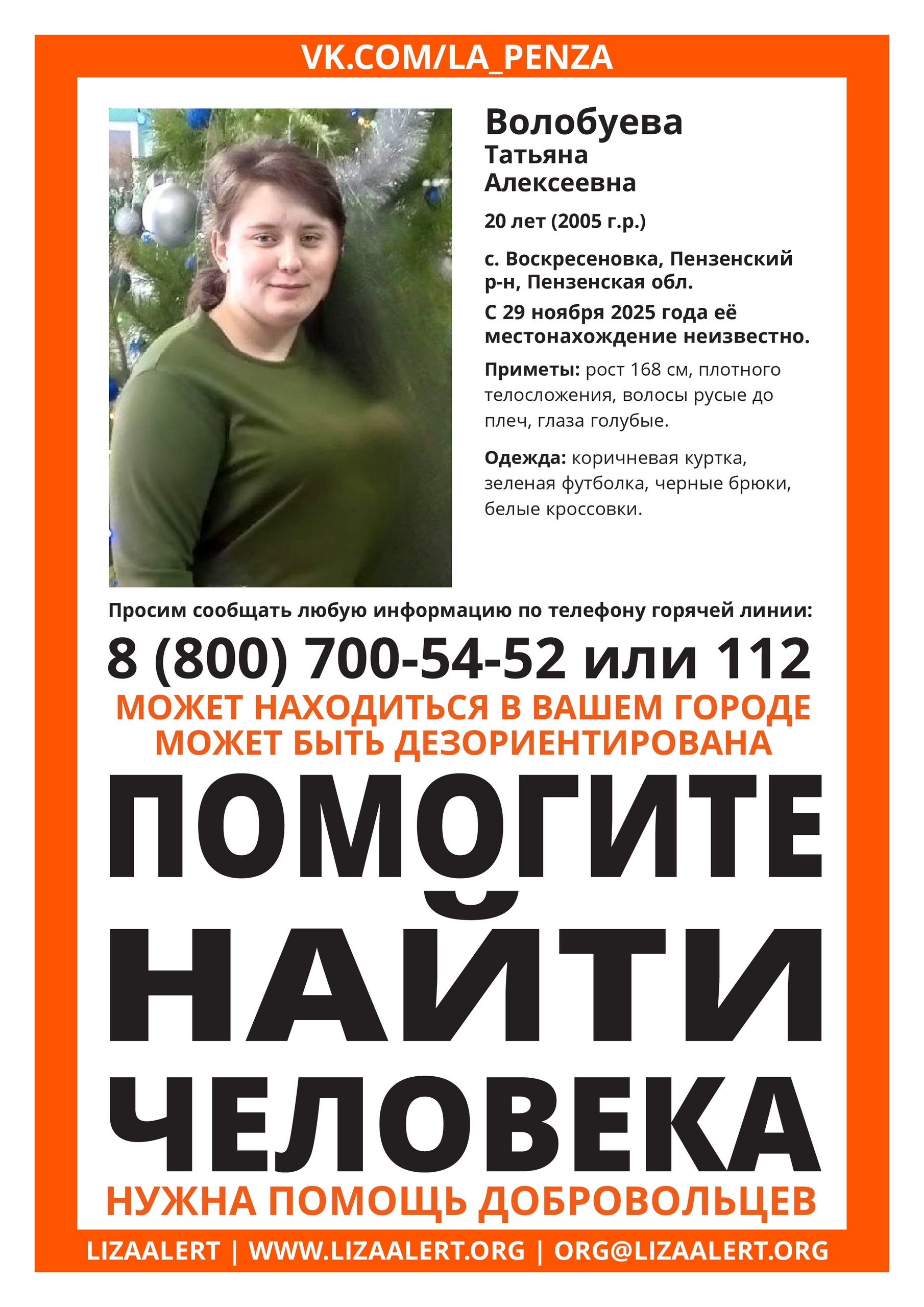 Пензенский поисковый отряд «Лиза Алерт» вечером обратился к жителям региона с просьбой помочь в поисках пропавшей 20-летней Татьяны Волобуевой. Волонтеры уточнили, что их особенно интересует информация от водителей, которые 29 ноября, в субботу, проезжали участок между селом Большая Валяевка и деревней Ольшанка Пензенского района в промежутке между 22:00 и 22:30. Возможно, кто-то видел девушку, подвозил её или зафиксировал на видеорегистратор.