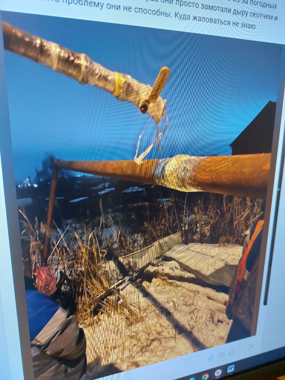 «Газа в трубе, скорее всего нет, а скотчем замотали, чтобы грязь внутрь не попала. Пока не будет оплаты за ремонт, а это частный сектор, никто сваривать ничего не будет, аварийки этим не занимаются, они только газ отключают», – написала одна из горожанок.