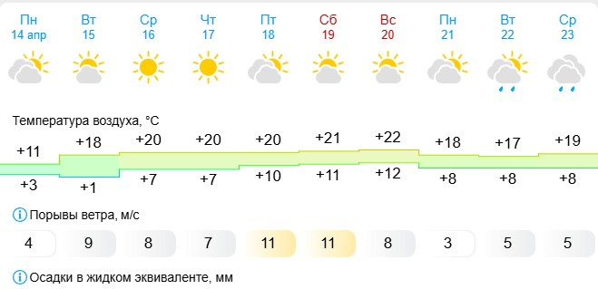 Однако уже завтра, 15 апреля, столбики термометров поднимутся до +18 градусов. В среду потепление продолжится, и воздух прогреется до +20 градусов. Теплая погода, около +20 градусов, продержится до воскресенья, 20 апреля, когда ожидается +22 градуса. Ночные температуры также повысятся и составят от +10 до +12 градусов.