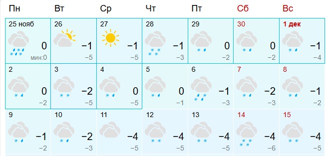 Ожидается, что снег, начавшийся в четверг, 29 ноября, будет идти с небольшими перерывами до середины декабря. Температура воздуха понизится и будет держаться в районе -4 градусов днем и -6 градусов ночью. В некоторые дни к снегу может добавиться дождь.