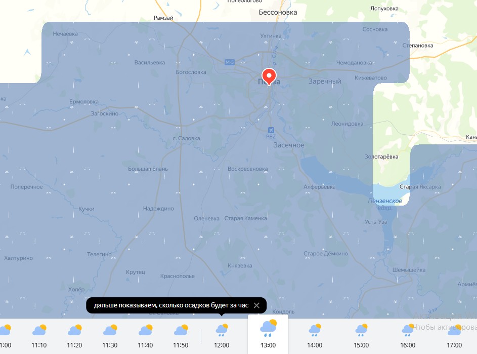 Судя по карте осадков, пик ливня уже пройден. В ближайшие часы дождь будет постепенно стихать, тучи начнут смещаться в сторону Засечного, а в центре города, возможно, даже выглянет солнце. К 18:00 ожидается комфортная погода.
