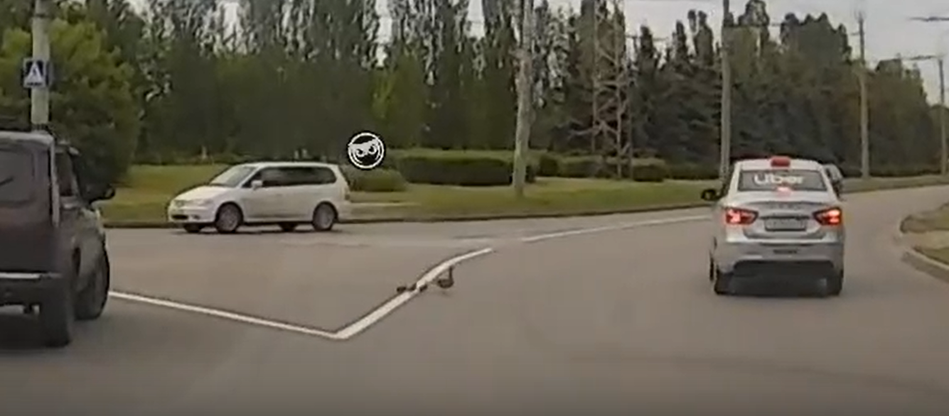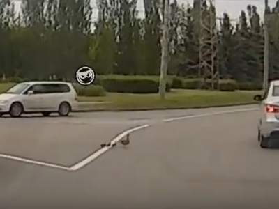 На нем видно, как мама утка вместе с детьми переходят дорогу. Автомобилисты, заметив семейство, стараются не задеть птиц.