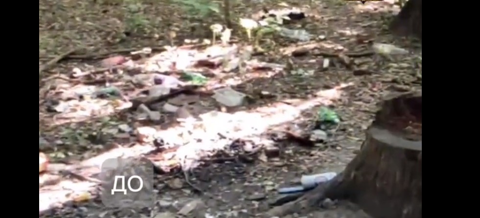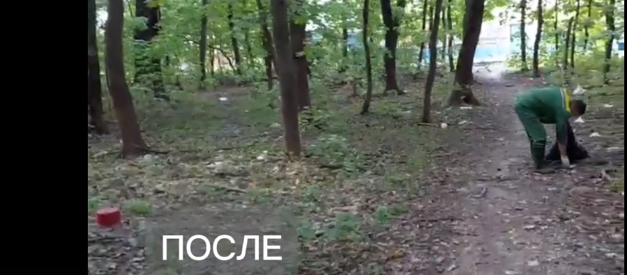 На ролике «до» видно разбросанные бутылки и другой мусор. Видео «после» демонстрирует, как сотрудники парка занимаются уборкой.