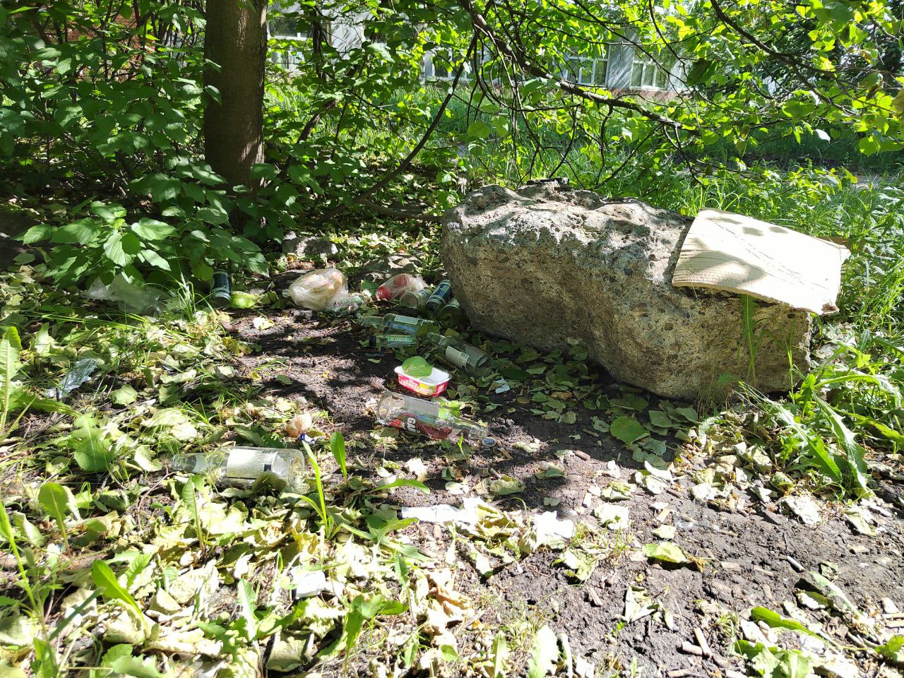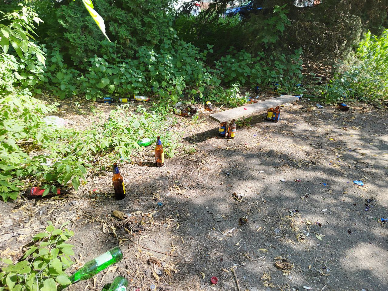 О том, чем здесь занимаются местные жители, ярко рассказывает мусор, оставленный после посиделок в кустах. Бутылки от алкоголя – самое невинное, что здесь можно обнаружить. Роль арт-объекта играет импровизированная «лавочка», которую местные алкаши соорудили из пивных бутылок и старой доски.