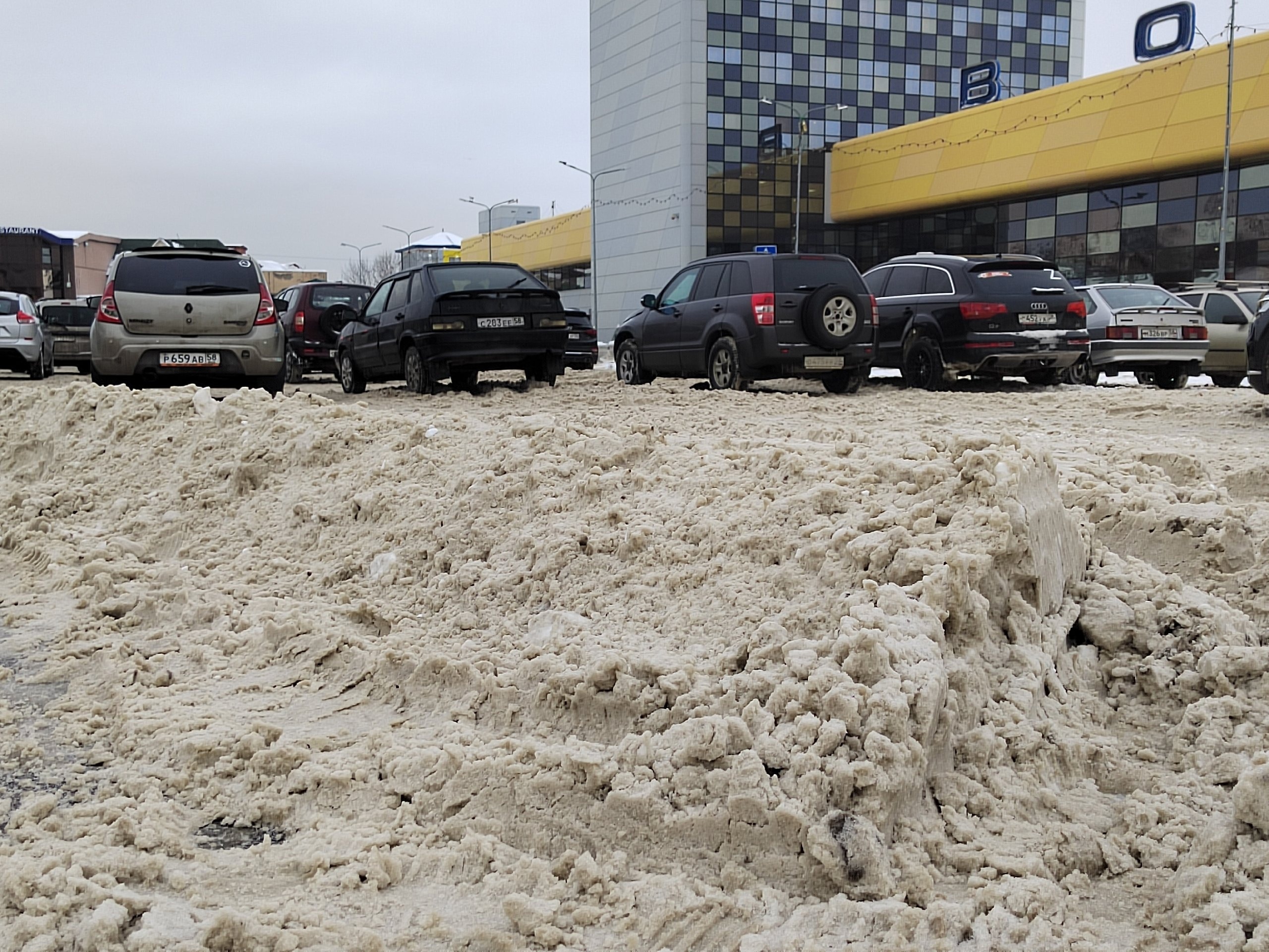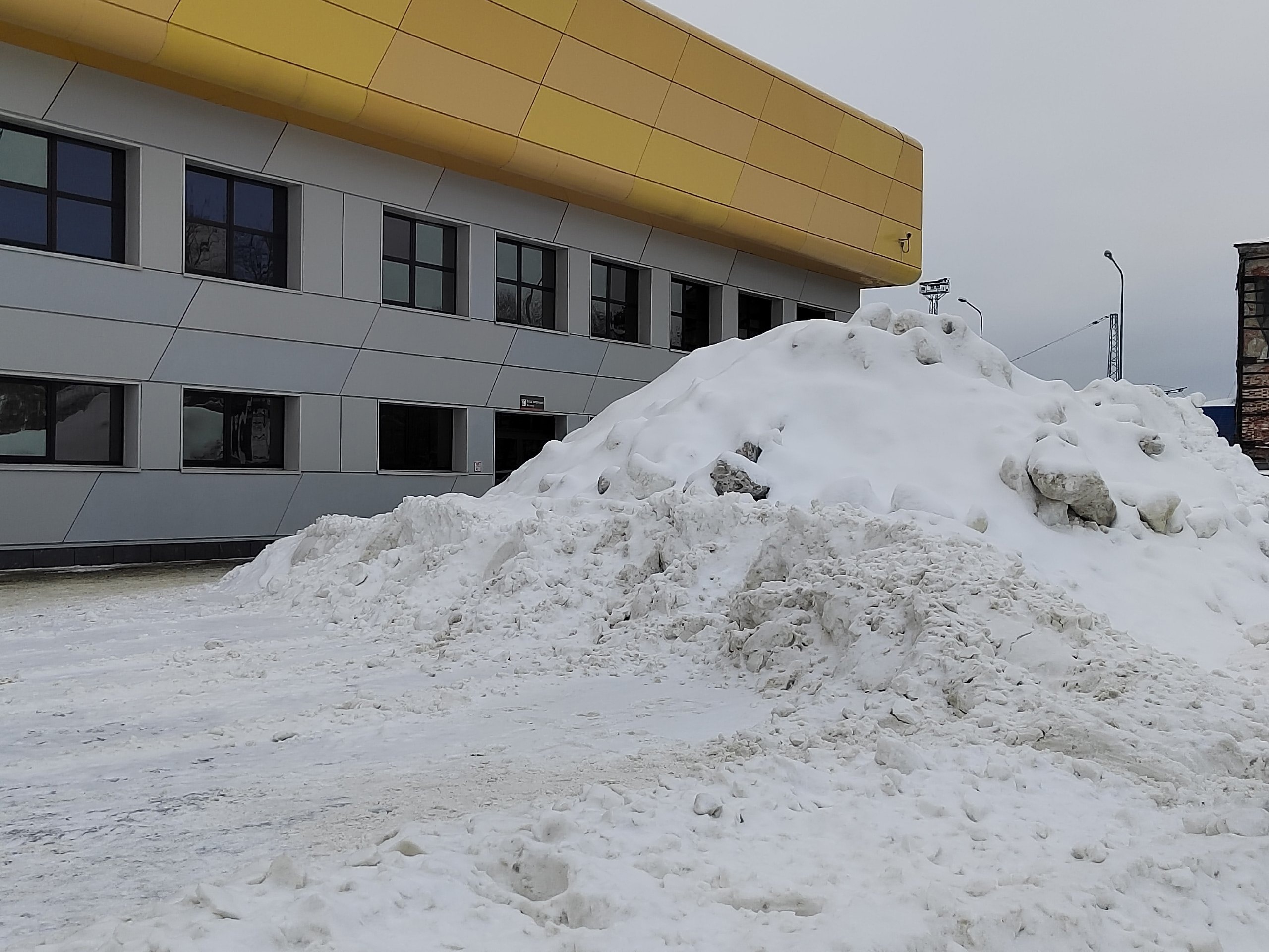 При этом пешеходные зоны расчищены, однако весь собранный снег работники почему-то сбросили в огромную кучу высотой чуть ли не в два этажа. Вывозить эту «красоту» пока никто не спешит.