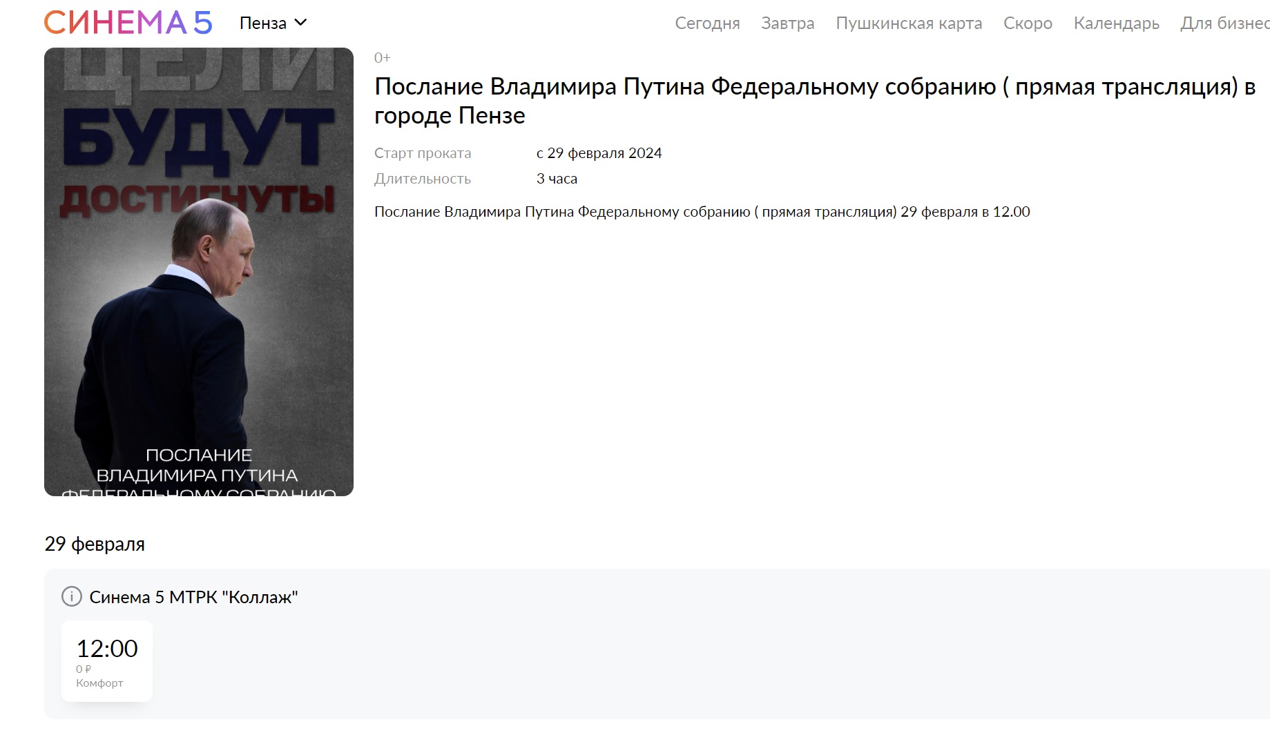 Один из кинотеатров города решил показать послание Владимира Путина на большом экране. Начало эфира запланировано на 12:00, его длительность составит около трех часов.
