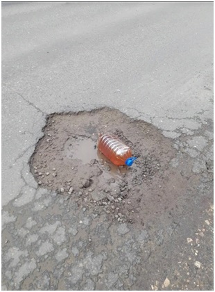 Чтобы продемонстрировать  высоту ее углубления водитель погрузил в канаву пятилитровую бутыль – емкость выступает из пробоины лишь наполовину. Фото – и видеоматериалами он поделился с редакцией «Столицы 58».