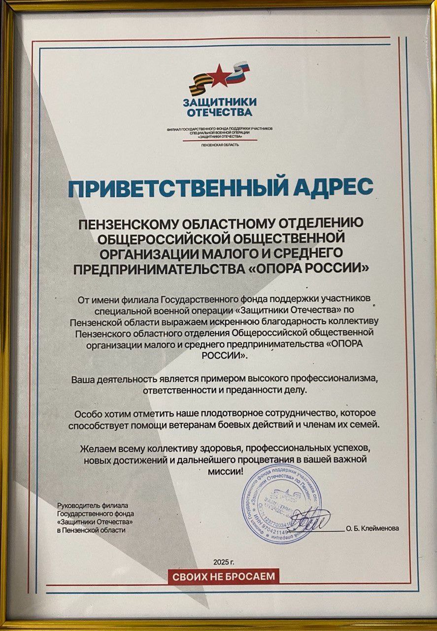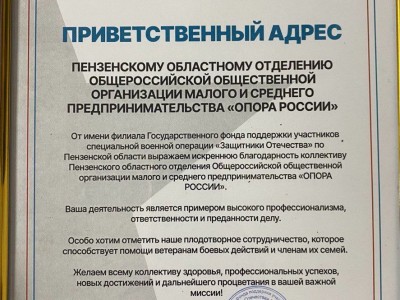 В рамках ярмарки Пензенскому отделению «ОПОРЫ РОССИИ» был вручен приветственный адрес от Фонда – за плодотворное сотрудничество и системную работу в сфере поддержки ветеранов боевых действий и членов их семей.