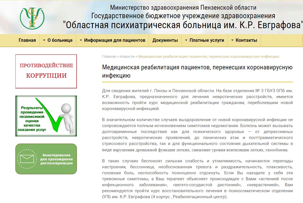 «Если Вы находите у себя эти тревожные симптомы, а Ваш терапевт объясняет происходящее с Вами «астенией после инфекционного заболевания», «вегето-сосудистой дистонией», «неврастенией», Вам рекомендуется пройти курс восстановительного лечения в психосоматическом отделении», – сообщается на сайте психдиспансера.