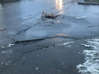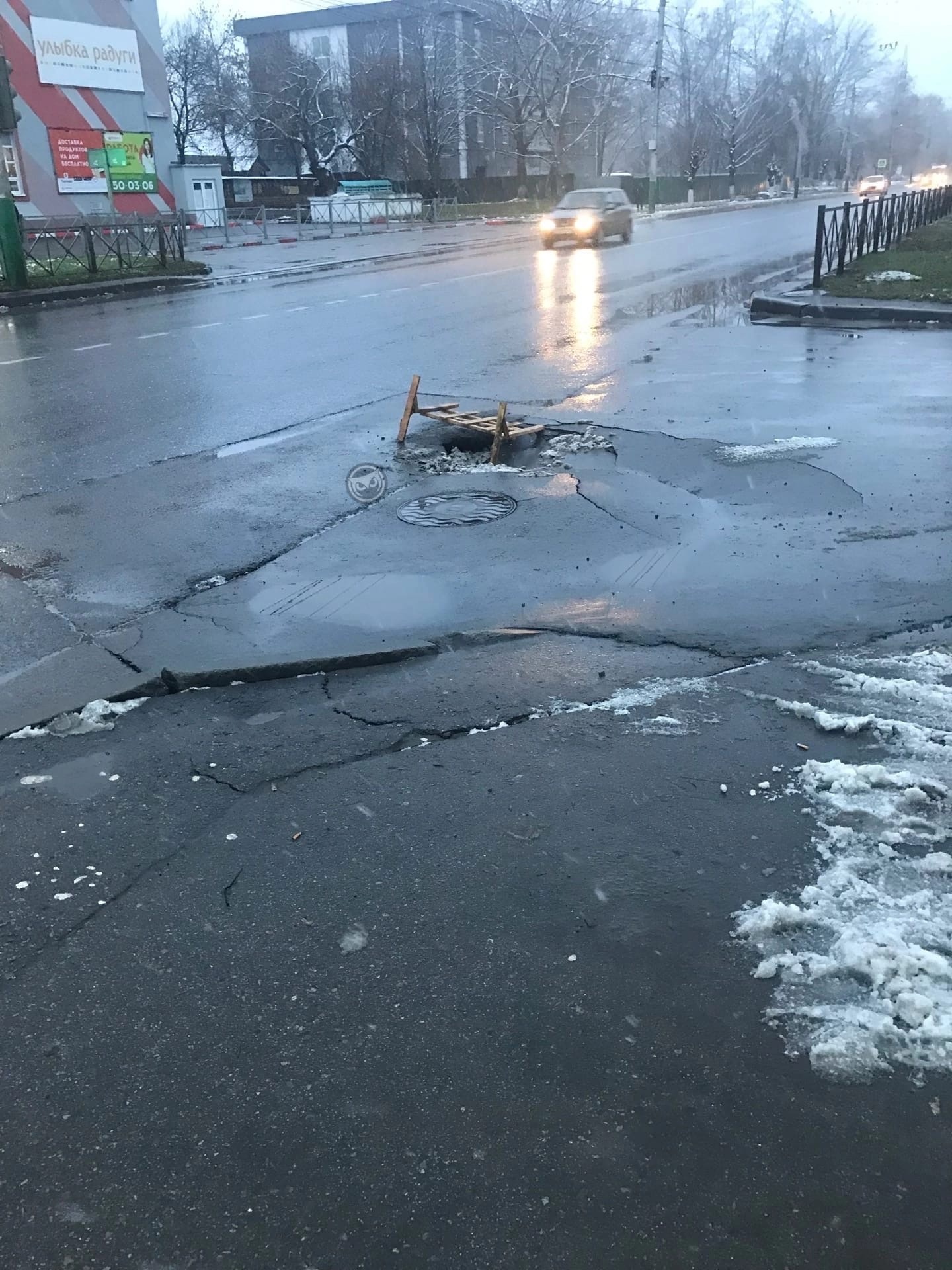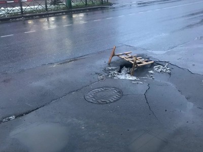 Один из очевидцев разместил фото, на которых запечатлел провал, образовавшийся на проезжей части. Судя по снимкам, от него во все стороны разошлись трещины. Дорожники попытались обозначить опасное место небольшим заборчиком, но тот уже сдуло ветром, так что невнимательный автомобилист может угодить в ловушку.
