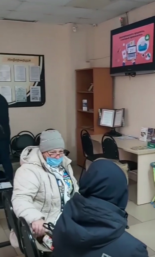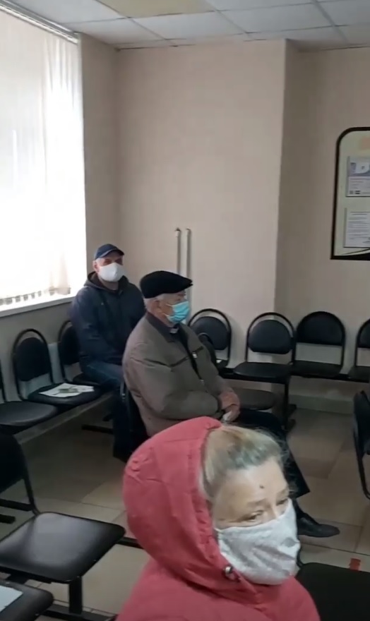 На записи видно, что в помещении находятся не больше 10 человек. Все они сидят достаточно далеко друг от друга. Каждый посетитель МФЦ надел маску.