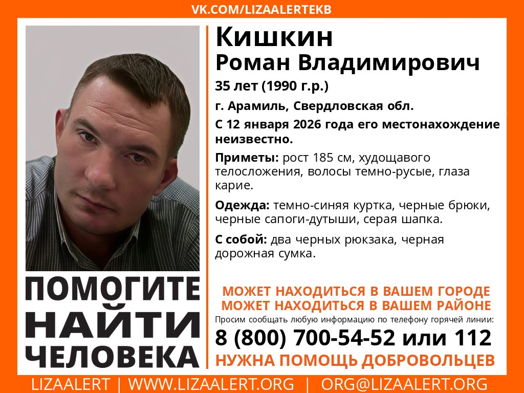 Поисковый отряд «Лиза Алерт» сообщил о розыске 35-летнего Романа Кишкина, который исчез 12 января 2026 года в городе Арамиль Свердловской области. По информации волонтеров, мужчина может находиться на территории Пензенской области.
