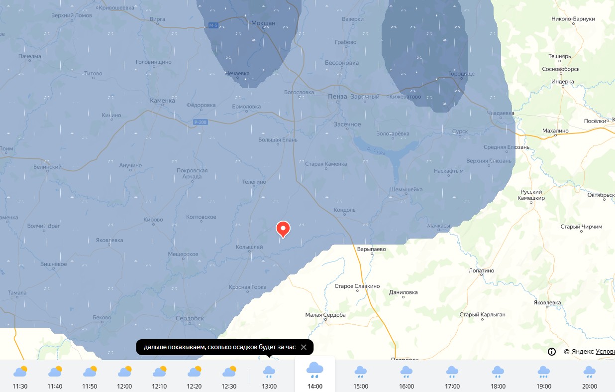 Первые капли упадут в Арбеково уже в 13:00. Затем облака дождевых туч постепенно накроют весь Пензенский район. К 17:00 ливень прольется над большей частью Пензенской области. Закончится ненастье приблизительно в 21:00.