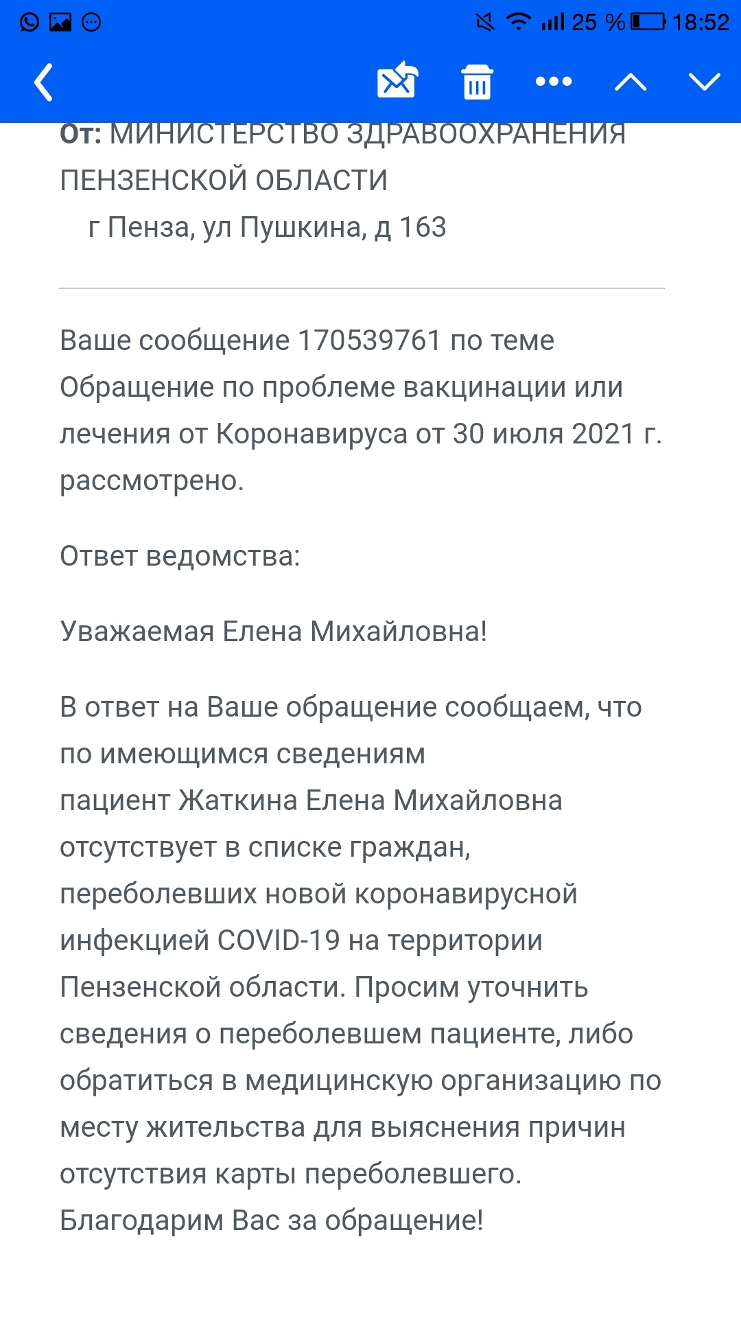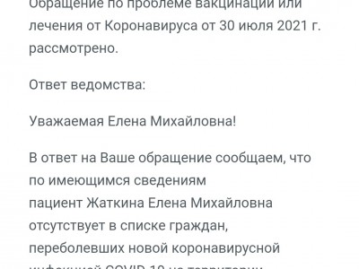 В доказательство автор поста опубликовала скриншот ответа, который ей пришел на Госуслугах. В нем сказано, что пациент с ее именем отсутствует в списке граждан, переболевших новой коронавирусной инфекцией на территории Пензенской области.