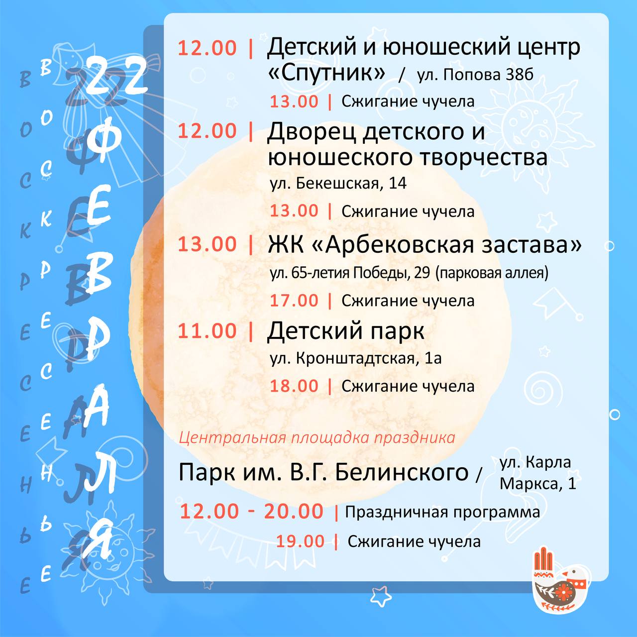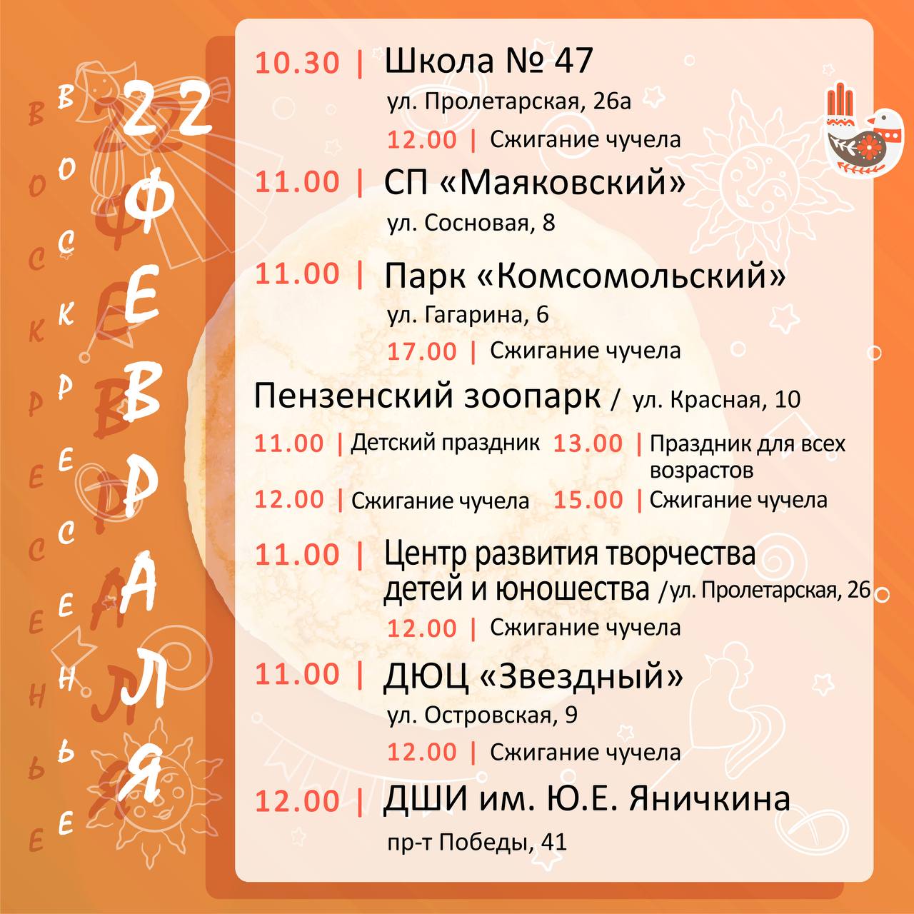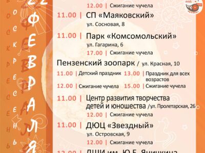Градоначальник призвал пензенцев приходить на праздник целыми семьями и брать с собой друзей. Для гостей подготовили традиционную развлекательную программу с горячими блинами, ароматным чаем и разнообразными конкурсами. Атмосферу праздника будут создавать выступления местных творческих коллективов, а традиционные народные забавы помогут участникам зарядиться бодростью и хорошим настроением перед приходом весны.
