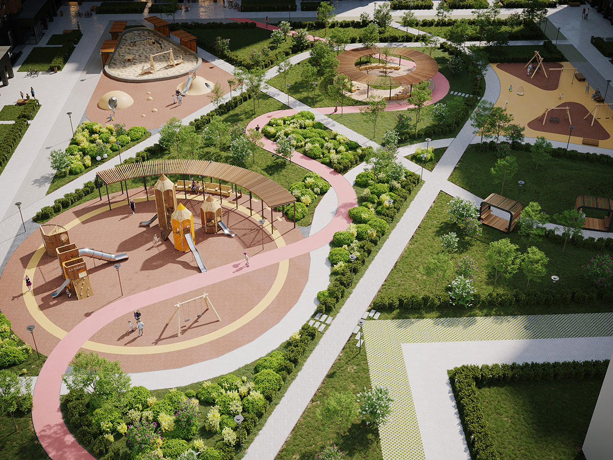 Сохранится концепция «двор без машин», с акцентом на детский отдых. Для взрослых жителей квартала — прогулочные зоны с извивающимися дорожками, воркаут и большое количество озеленения.