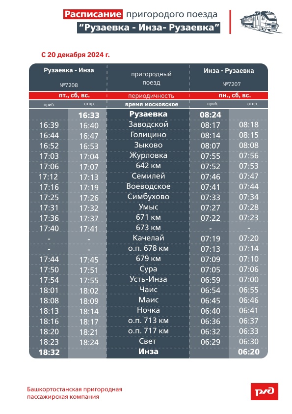 С 20 декабря пригородный поезд №7208 Рузаевка – Ночка будет продлен до станции Инза. Поезда будут курсировать по пятницам, субботам и воскресеньям.