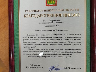 8 сентября, в международный день солидарности журналистов, информационное издание «Столица 58» наградили благодарностью губернатора Пензенской области Олега Мельниченко.