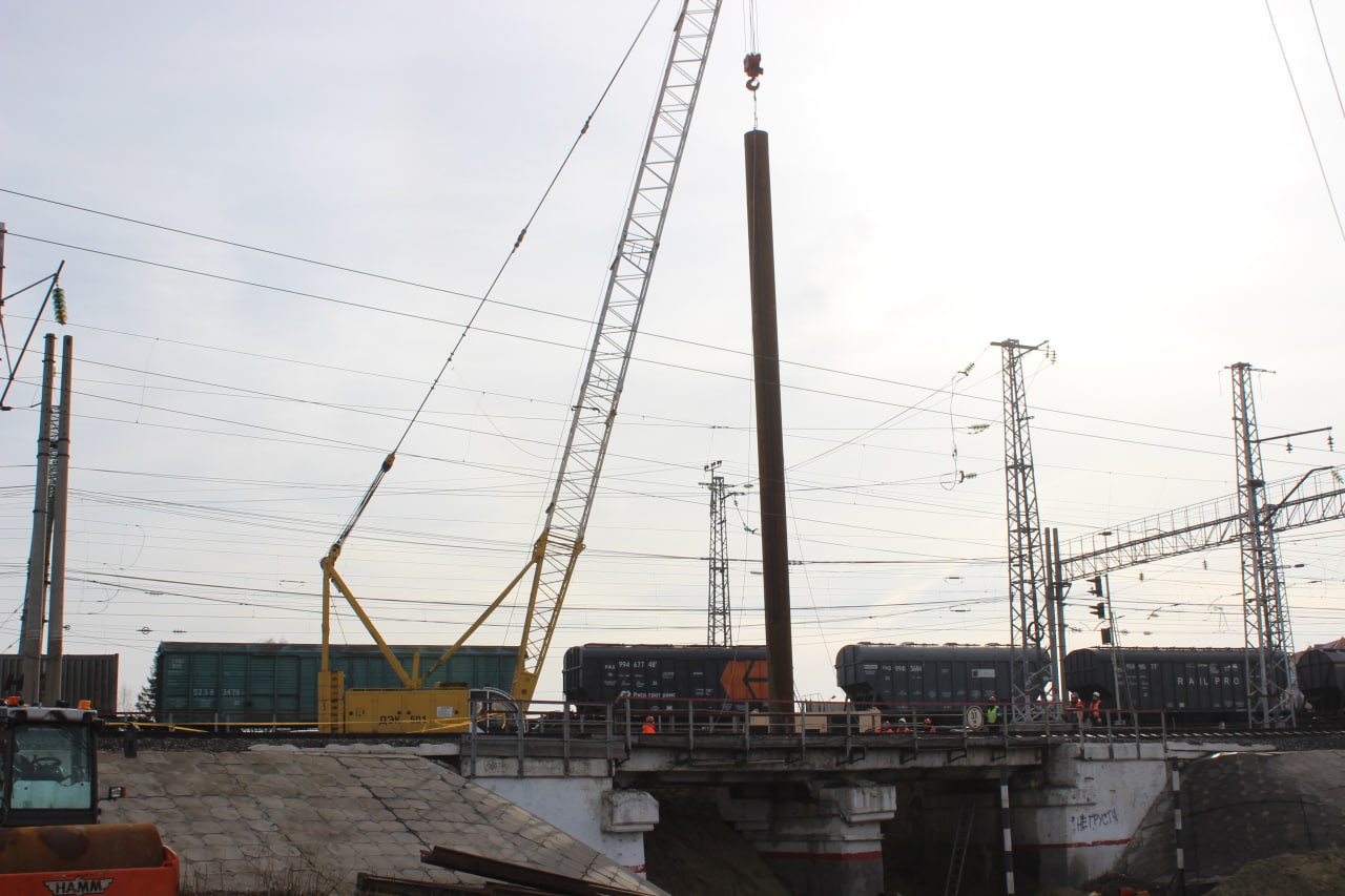 В настоящее время на объекте активно строится временная объездная железная дорога. Уже завершена забивка шпунта Ларсена и начата забивка трубошпунта для устройства подпорной стенки. Этот этап крайне важен, так как после завершения строительства временной железной дороги строители приступят к демонтажу существующего и возведению нового однопутного железнодорожного путепровода.