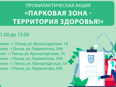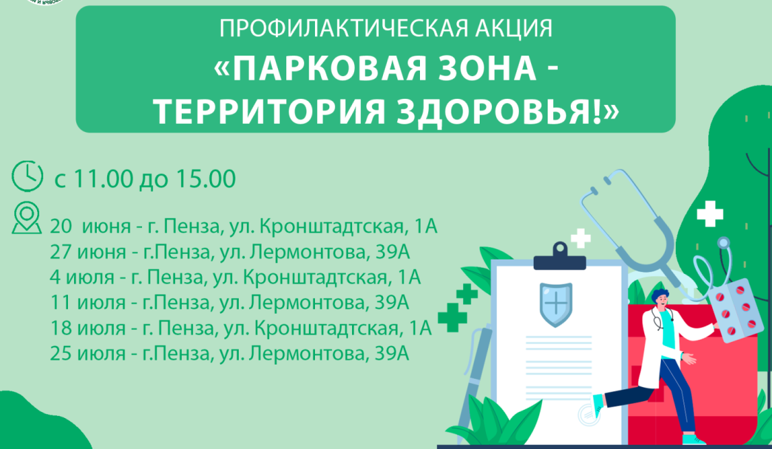 Сегодня, 20 июня, с 11:00 до 15:00 в Детском парке на улице Кронштадтской, 1А, пройдет акция «Парковая зона – территория здоровья!». Жителей и гостей Пензы ждут бесплатные консультации врачей, экспресс-диагностика и веселые активности для всей семьи.
