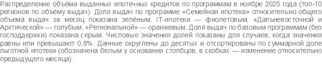 В ноябре лидирующие позиции по доле рыночных ипотечных программ в общем объеме выдач заняли Мурманская область (34,7%) и Республика Коми (33,6%). Среди десяти ведущих регионов по объёму выданных кредитов, относительно высокий спрос на базовую ипотеку сохранился в Московской области (30,7%) и Москве (25,1%).