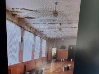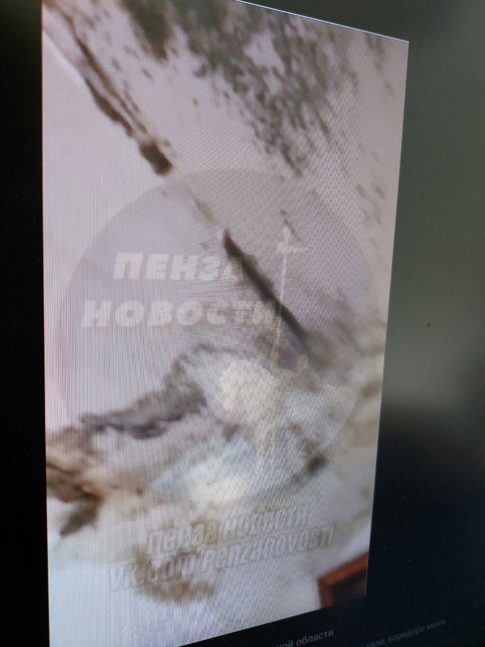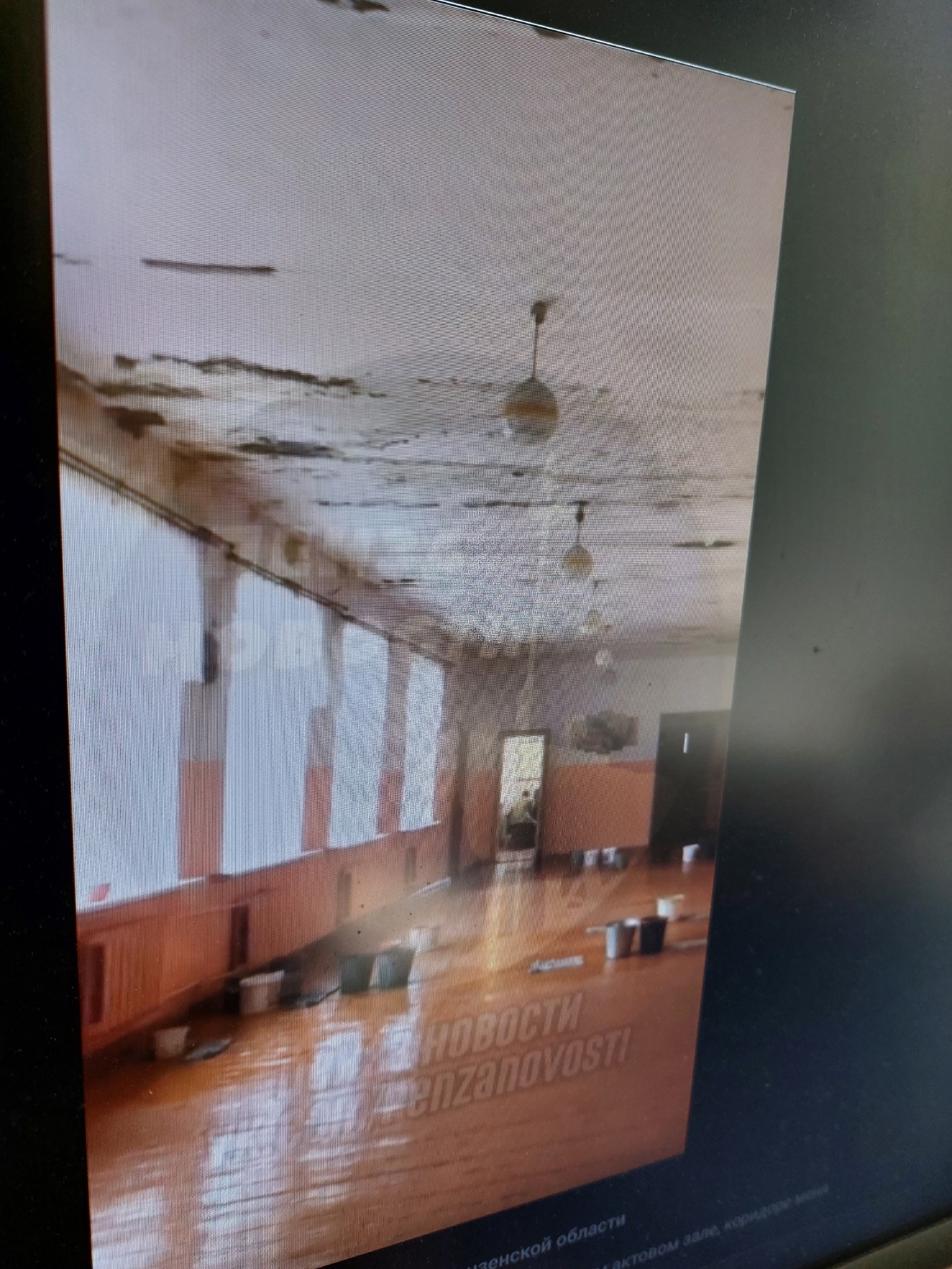 На записи видно облезлые потолки, с которых на пол течет вода. Судя по всему, у здания давно не ремонтировали крышу. Также можно заметить ведра, расставленные по помещению для сбора капающей воды.