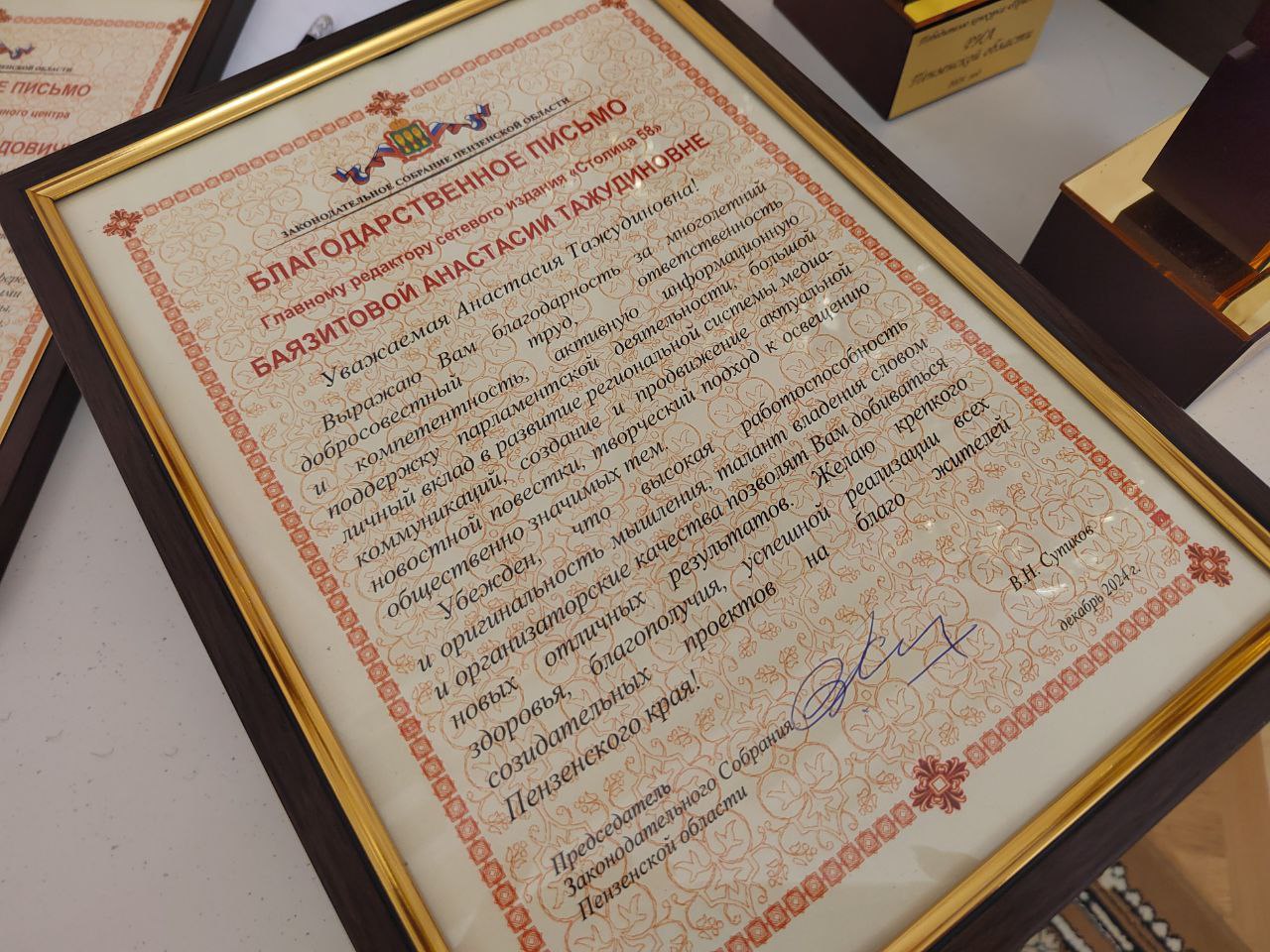 Среди награжденных представителей СМИ — главный редактор сетевого издания «Столица 58» Анастасия Баязитова. Ей вручили Благодарственное письмо Законодательного Собрания за многолетнее плодотворное сотрудничество, высокие результаты профессиональной деятельности и большую работу по организации информационного освещения работы депутатов.