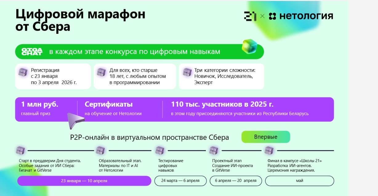 В конкурсе «Цифровой марафон» уже зарегистрировались десятки тысяч участников из 89 регионов страны. Наибольшее количество заявок поступило из Москвы и Московской области, Санкт-Петербурга, Краснодарского края, а также Свердловской, Нижегородской и Новосибирской областей. Регистрация продлится до 3 апреля 2026 года.