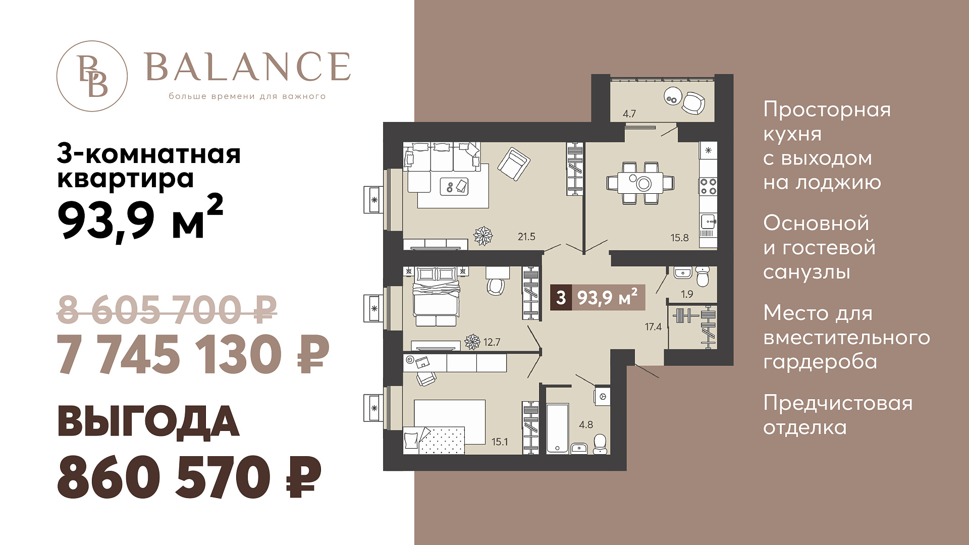 Квартира в «Балансе» — это 94 квадратных метра в кирпичном доме комфорт-класса. При входе есть место для вместительного гардероба. Из просторной кухни — выход на лоджию. И в комнатах, и в санузлах выполнена предчистовая отделка. Поэтому времени на переезд много не потребуется.