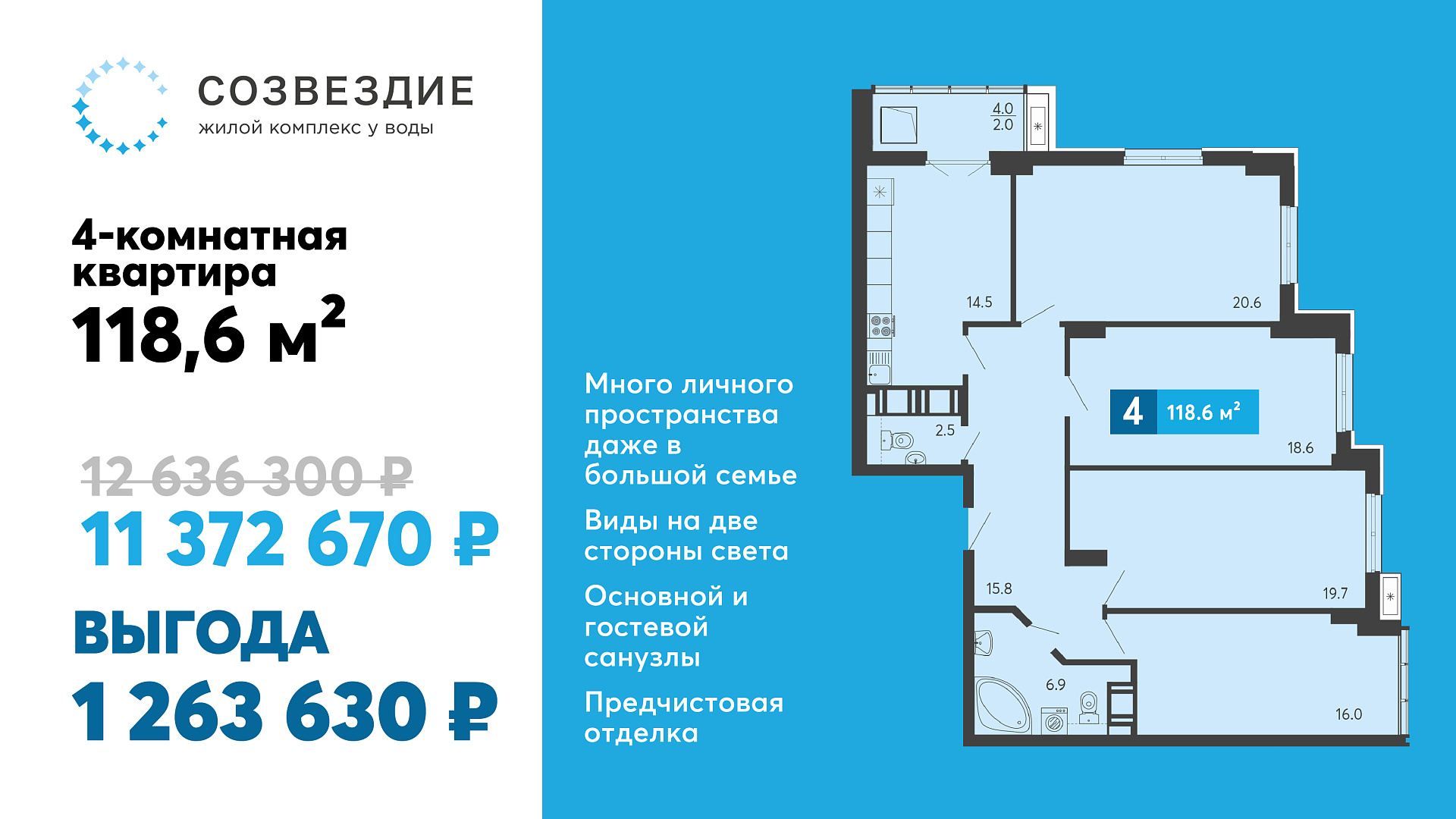Квартира в «Созвездии» — это 118,6 квадратных метров в доме «Атлас» класса космос. Здесь пространство особенно подчеркивается большим количеством естественного света из широких оконных проемов с видами на две стороны. Предчистовая отделка от застройщика также поможет скорее начать процесс переезда.