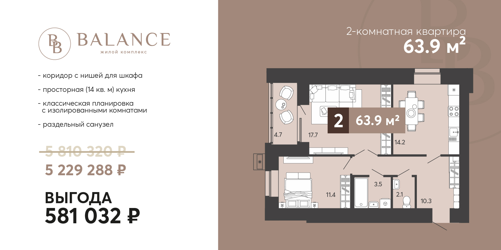 На этой неделе, с 23 по 29 июня, цена снижена на 2-комнатную квартиру площадью 64 кв. м. Она в жилом комплексе «Баланс», расположенном в ближнем Арбекове.