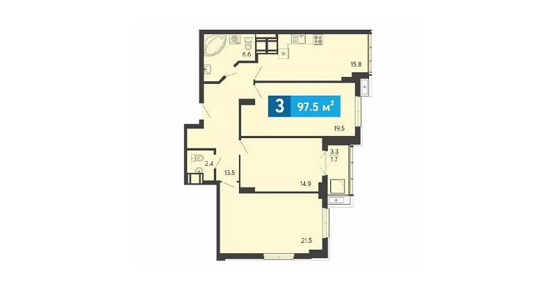 «Созвездие» – это проект класса космос с современными техническими и инженерными решениями, а также потрясающими видами на лес и озеро. Рассмотрим планировку 3-комнатной квартиры  площадью 97,5 кв. м в корпусе «Атлас».