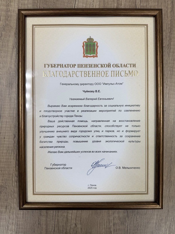 «Выражаю Вам искреннюю благодарность за социальную инициативу и плодотворное участие в реализации мероприятий по озеленению и благоустройству города Пензы. Ваша действенная помощь способствует не только улучшению внешнего вида городских улиц и парков, но и формирует у граждан чувство сопричастности и ответственность за сохранение богатства природы, повышение уровня экологической культуры населения региона».