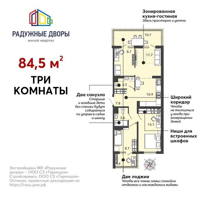 Застройщики ЖК «Радужные дворы» – ООО СЗ «Термодом-Стройсервис», ООО СЗ «Термодом-Оптима», проектные декларации на https://наш.дом.рф.