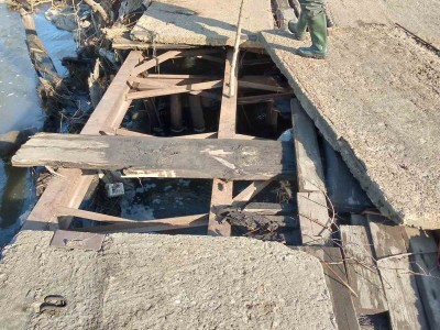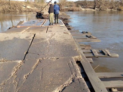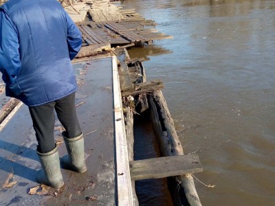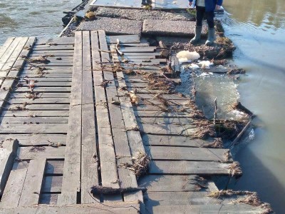 На снимках видны огромные провалы, появившиеся на сооружении. Теперь проехать по мосту на машине не представляется возможным. Даже пешеходам стоит быть осторожнее при пересечении реки, вся конструкция выглядит шаткой и ненадежной.