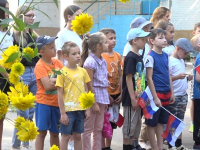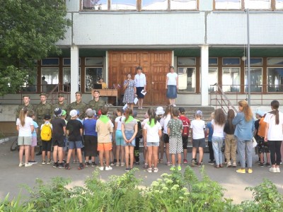 В пришкольном лагере школы №8 на праздничной линейке участники торжества подняли флаг и исполнили гимн. Директор лагеря поздравила собравшихся, дети прочитали стихи.