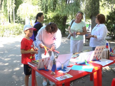 В городском парке для кузнечан подготовили патриотическую акцию. Всем, кто отвечал на вопросы по истории российского флага раздавали ленточки с триколором, была организована выставка книг, посвященных возникновению, истории и значению российского флага.