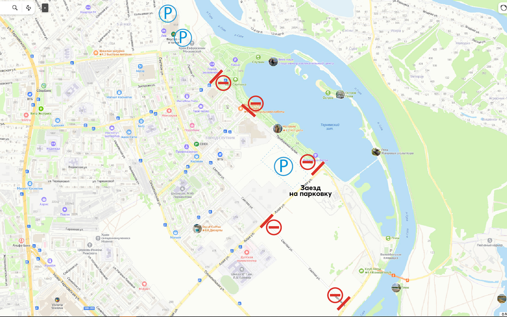 - в поле параллельно Прибрежному бульвару (заезд с ул. Алой, парковка на 200 мест).