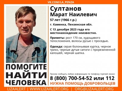 Накануне, 6 января, волонтеры из поискового отряда «Лиза Алерт» опубликовали новую ориентировку на розыск человека. В Каменке Пензенской области пропал 57-летний Марат Султанов.