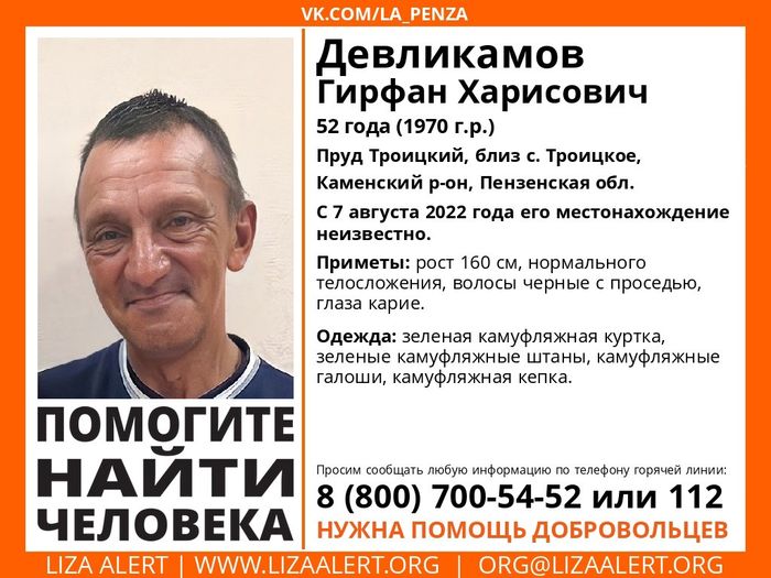 Волонтеры поискового отряда «Лиза Алерт Пенза» ищут жителя Каменского района Гирфана Девликамова. Он перестал выходить на связь с 7 августа.