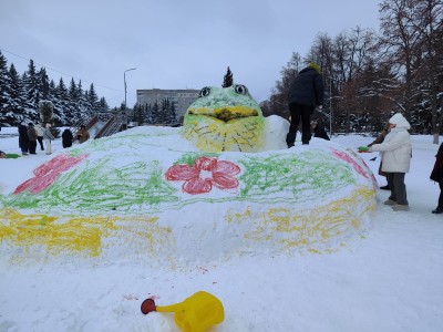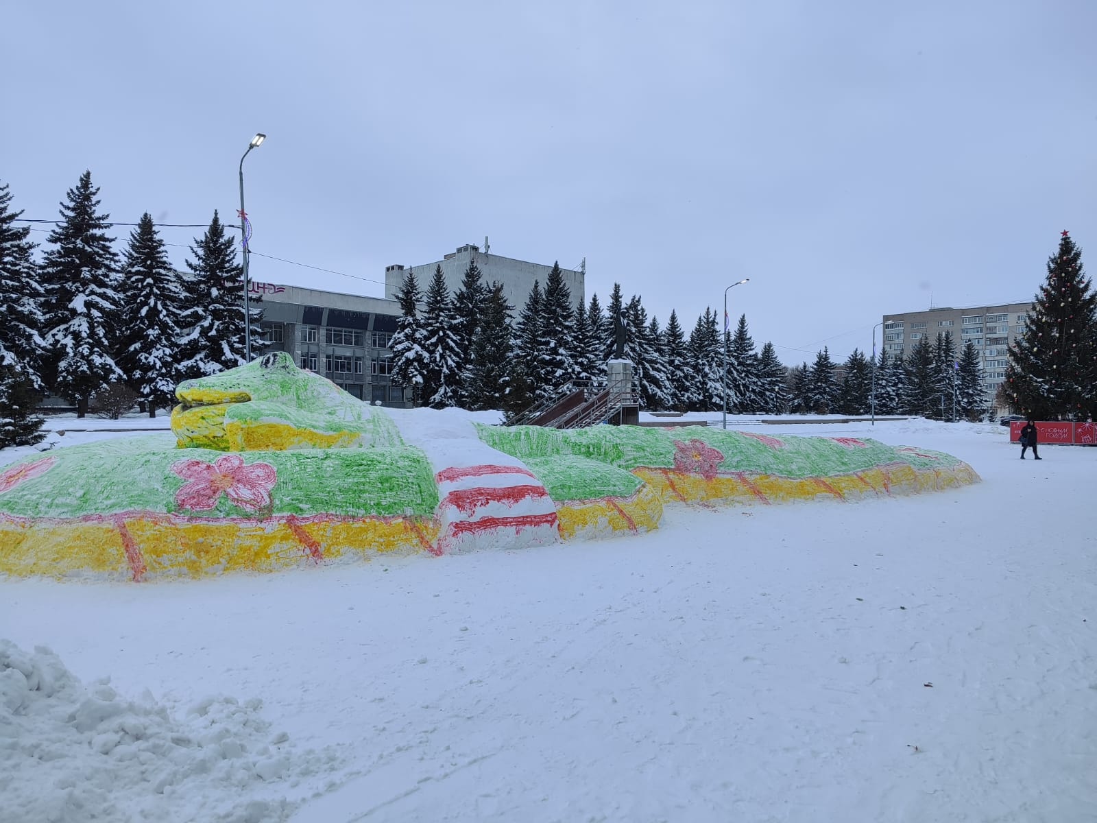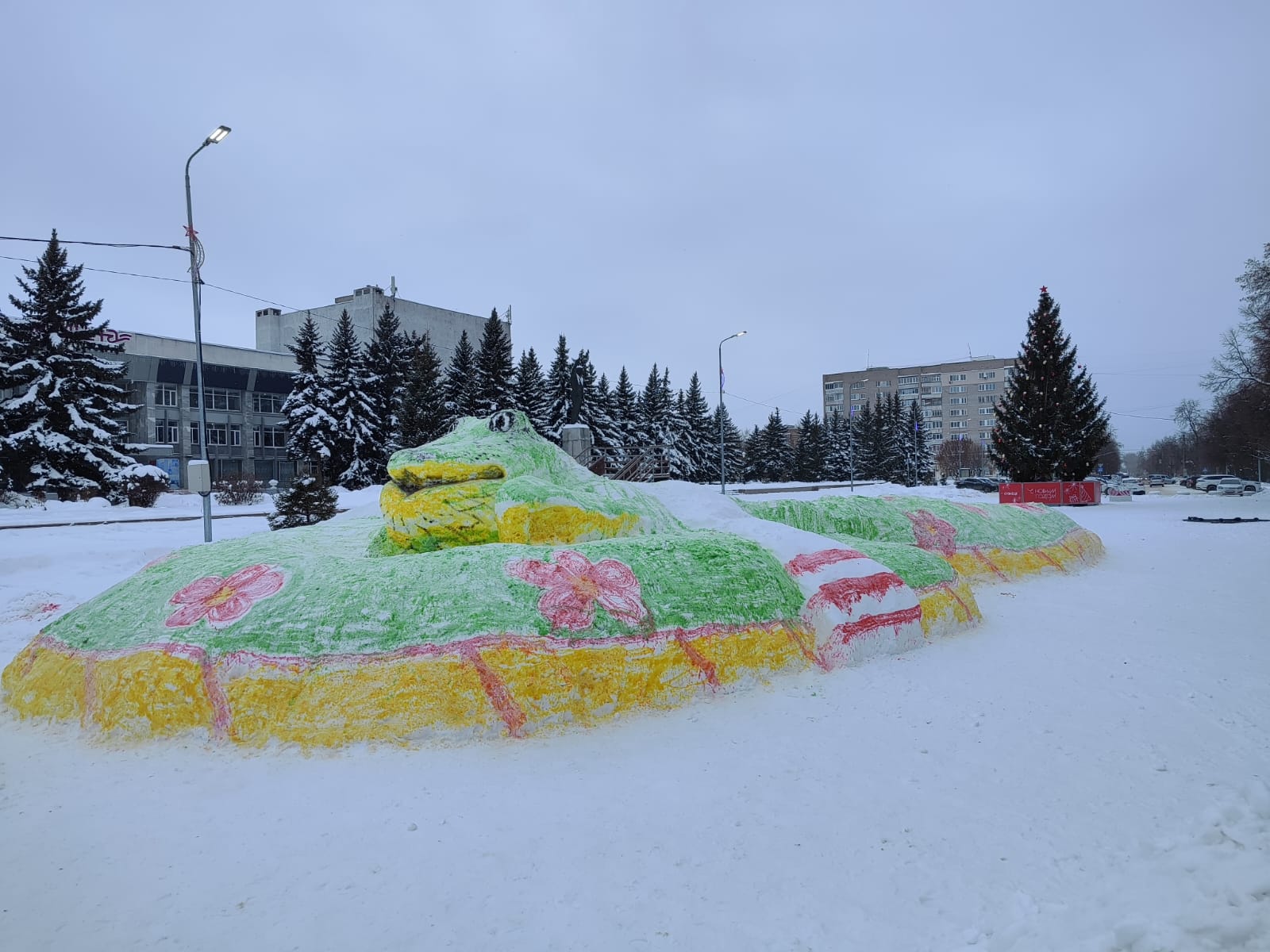Снежный шедевр создали студенты под руководством преподавателей местной художественной школы. Площадь также украшают яркие светящиеся инсталляции.
