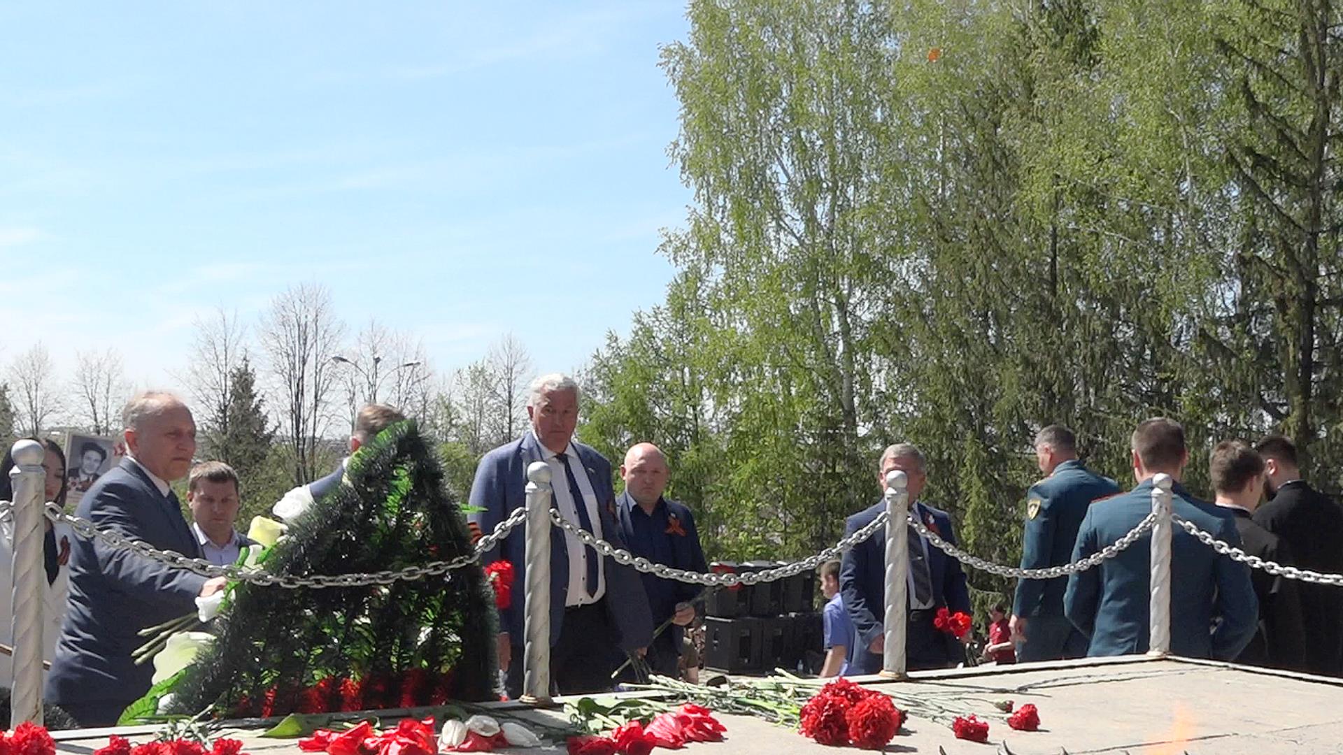 После окончания митинга состоялась церемония возложения цветов к Вечному огню у памятника трем солдатам.