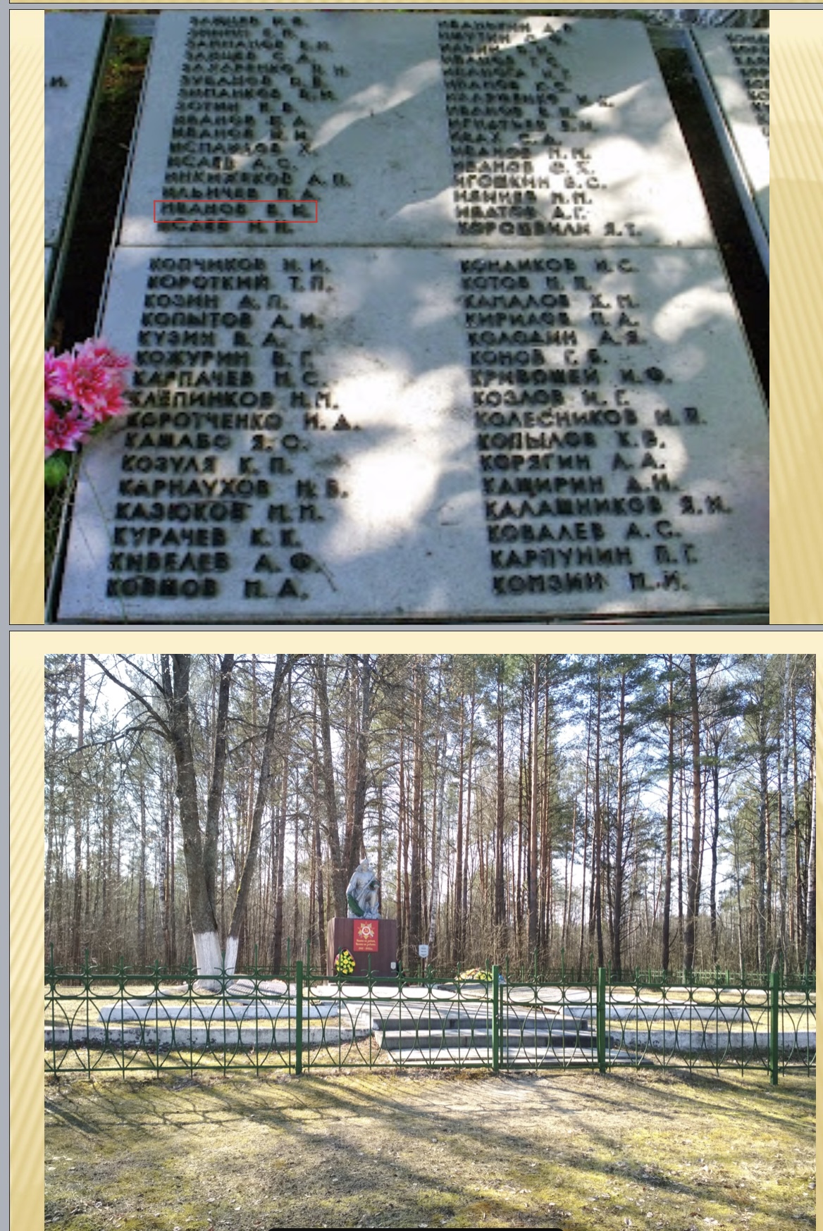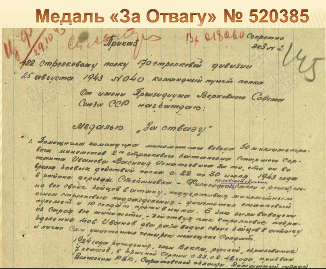 В областном Минобре сообщают, что Василий Иванов был призван на фронт в 18 лет и служил наводчиком миномета. Он был награжден двумя медалями «За отвагу» за бои под Орлом летом 1943 года. Погиб красноармеец в феврале 1944 года в боях за освобождение деревни Великий Бор в Белоруссии. Пензенские поисковики планируют посетить его могилу в братском захоронении в июле этого года.