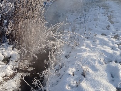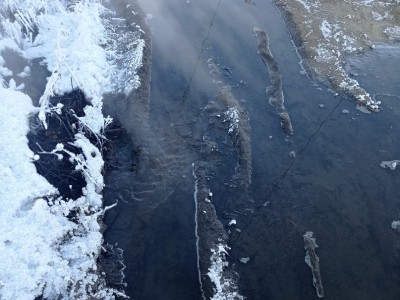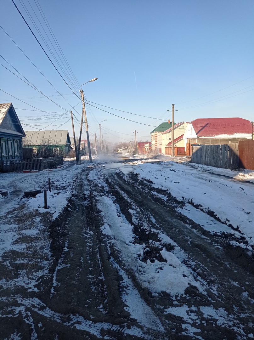 Автор публикации приложил фотографии, на которых видно, как по дороге текут ручьи. Над ними в воздух поднимается пар. Дороги покрыты снегом и наледью, напоминают больше ледяной аттракцион, чем проезжую часть.