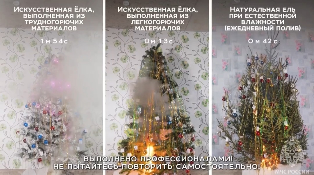 Судя по видео, опубликованному сотрудниками МЧС в телеграмм-канале, быстрее всего пламя распространилось по веткам искусственного дерева, выполненного из легкогорючих материалов, огонь охватил его за 24 секунды. Живая елка вспыхнула через 1 минуту 38 секунд. Самой безопасной оказалась искусственная ель из трудногорючих материалов – огонь распространился через 4 минуты 24 секунды.