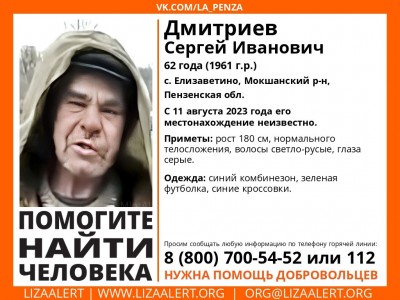 Сегодня, 14 августа, пензенские волонтеры из поискового отряда «Лиза Алерт» опубликовали новую ориентировку на розыск. В Мокшанском районе в селе Елизаветино пропал 62-летний Сергей Дмитриев.