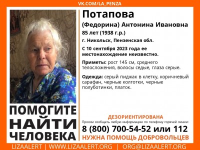 В Никольске разыскивают 85-летнюю Потапову (Федорину) Антонину Ивановну, которая ушла из дома 10 сентября и пропала. Родственники совместно с волонтерами и полицией организовали поиски старушки.